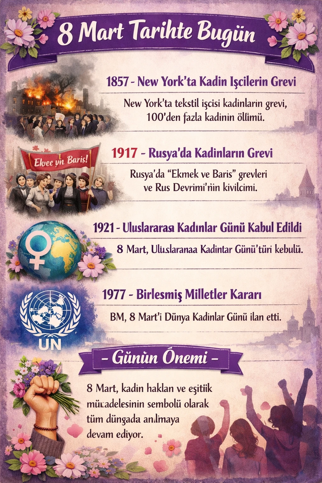 8 Mart, dünya genelinde kadın hakları, eşitlik ve toplumsal farkındalık için düzenlenen etkinliklerle anılmaya devam ediyor. Kadınların sosyal, ekonomik ve siyasi hayattaki hak mücadelesi bu tarihin en önemli sembollerinden biri olarak kabul ediliyor.