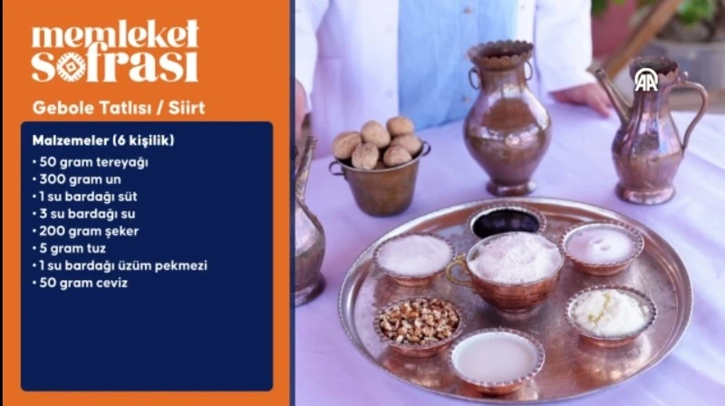 Karatay Belediyesinin katkılarıyla hazırlanan proje kapsamında Siirt mutfağının önemli tatlılarından biri olan gebole tatlısının yapımı ve hikâyesi de Ulus Aile Destek Merkezi'nde (ADEM) koordinatör Nurten Temiz ve ADEM çalışanlarının destekleriyle izleyicilerle buluşturuldu.