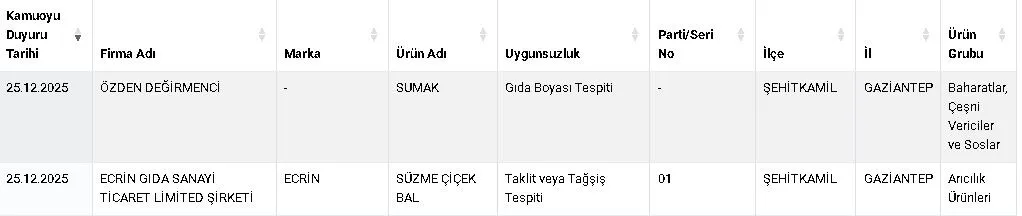 Bakanlık tarafından yayımlanan son listede, başta sumak ve bal olmak üzere birçok üründe yapılan hileler kamuoyuna duyurulurken, Gaziantep’ten 4 firmanın da listede yer alması dikkat çekti.