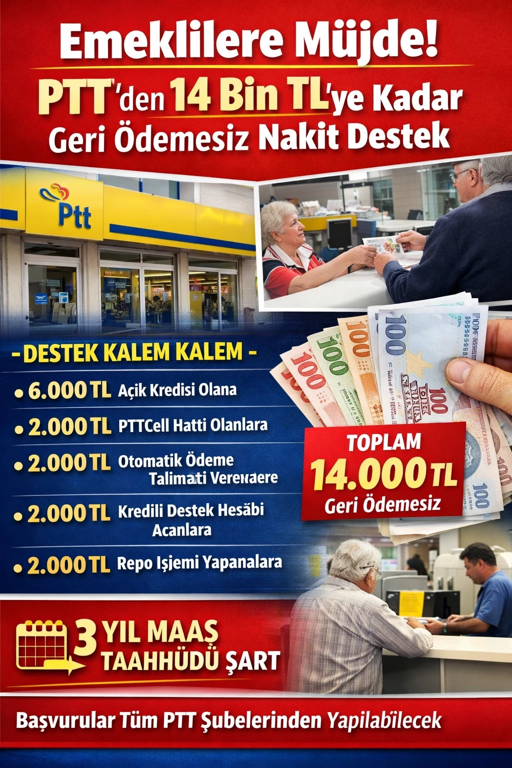 Destekten yararlanmak isteyen emeklilerin maaşlarını 3 yıl boyunca PTT’den alma taahhüdü vermesi gerekiyor. Kampanyaya başvurular Türkiye genelindeki PTT şubelerinden yapılabilecek.