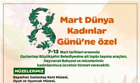 Gaziantep Büyükşehir Belediyesi (GBB) tarafından 8 Mart Dünya Kadınlar Günü dolayısıyla 7-13 Mart tarihlerinde Büyükşehire ait toplu taşıma araçları, Doğal Yaşam Parkı (Hayvanat Bahçesi) ve müzeler kadınlar için ücretsiz hizmet verecek.