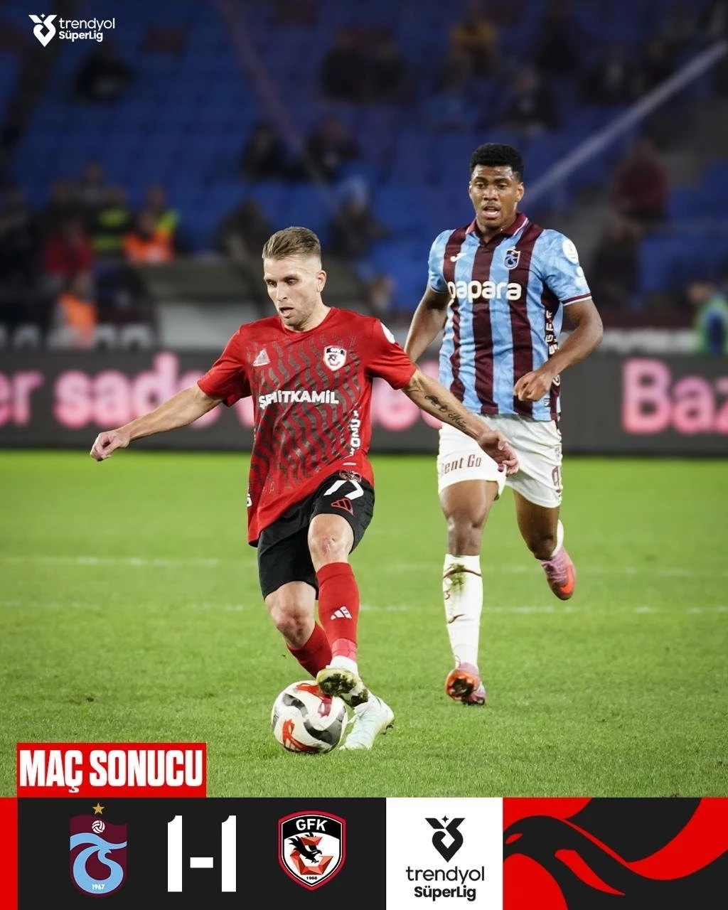 Maçta takımını öne geçiren golü Kevin Rodrigues kaydederken, Trabzonspor’un eşitlik golüyle karşılaşma 1-1 tamamlandı. Gaziantep FK, bu sonuçla deplasmandan tek puanla dönerek ligdeki yükselişini sürdürdü.