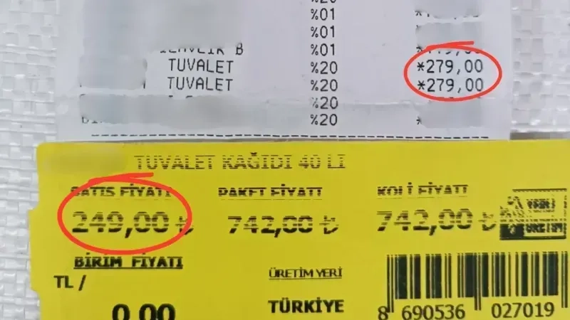 Gaziantep'in Şahinbey ilçesinde faaliyet gösteren zincir marketten alışveriş yapan vatandaşlar mağdur ediliyor. Bir aile tarafından sosyal medyada paylaşılan görüntülerde indirimli olarak satışa sunulan ürünün kasa noktasında farklı fiyatla satıldığı ortaya çıktı. Etiket fiyatı 249 TL olarak görünen ancak kasada 279 TL çıkan ürün nedeniyle mağdur olan aile yetkili birimin gereğini yapmasını talep etti.