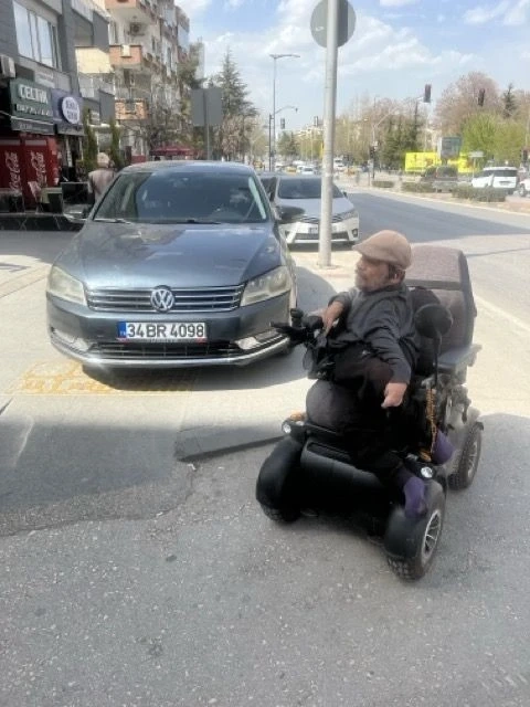 Fotoğrafı çeken kişi ise olayın doğrudan mağduru olan bir engelli birey. Elektrikli tekerlekli sandalyesiyle yolda ilerlerken kaldırıma çıkmak isteyen vatandaş, rampanın önünün araçla kapalı olduğunu görünce durmak zorunda kaldı. Sadece engelli rampası değil, kaldırım üzerindeki sarı şeritli kılavuz yol da tamamen işgal edilmişti.