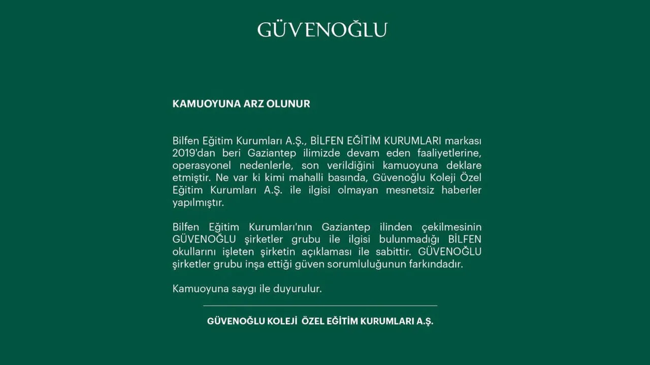Gaziantep eğitim camiasında geniş yankı uyandıran gelişmelerle ilgili yeni bir açıklama geldi. Bilfen yetkililerinin kamuoyuna yaptığı değerlendirmeden iki gün sonra, eleştirilerin odağında yer alan Güvenoğlu Şirketler Grubu da konuya ilişkin yazılı bir açıklama yayımladı.