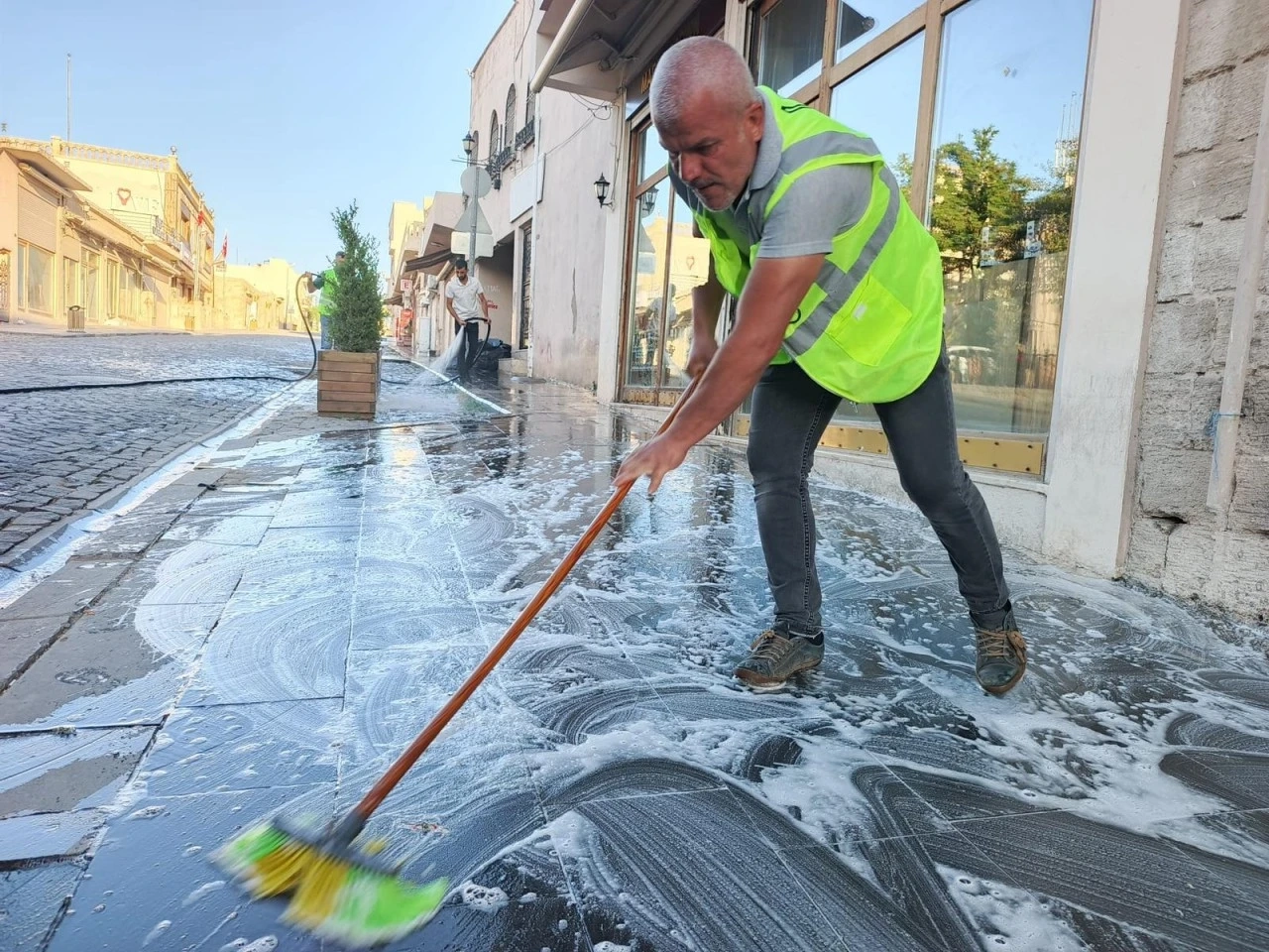 Tarihi sokakları, taş evleri ve eşsiz manzarasıyla her yıl binlerce ziyaretçiyi ağırlayan Mardin, bayram tatili süresince artacak ziyaretçi sayısı göz önüne alınarak kapsamlı bir temizlik programına alındı. 1. Cadde başta olmak üzere, yoğun yaya hareketliliğinin beklendiği alanlarda yol ve kaldırım yüzeyleri deterjanlı suyla yıkanarak hijyenik bir hale getirildi.
