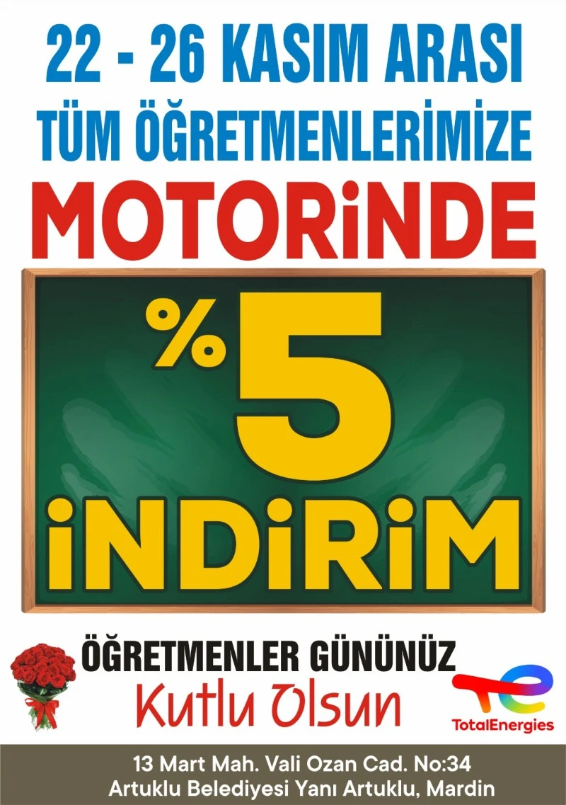 Mardin’in Artuklu İlçesinde bulunan Öğretmen Kökenli Zeynep Rüya Köyan Ağarıkçe’ya ait TotolEnergise akaryakıt İstasyonu 22-26 Kasım tarihleri arasında öğretmenler günü nedekiyle, öğretmeneler Motorinde %5 indirim yapacak.