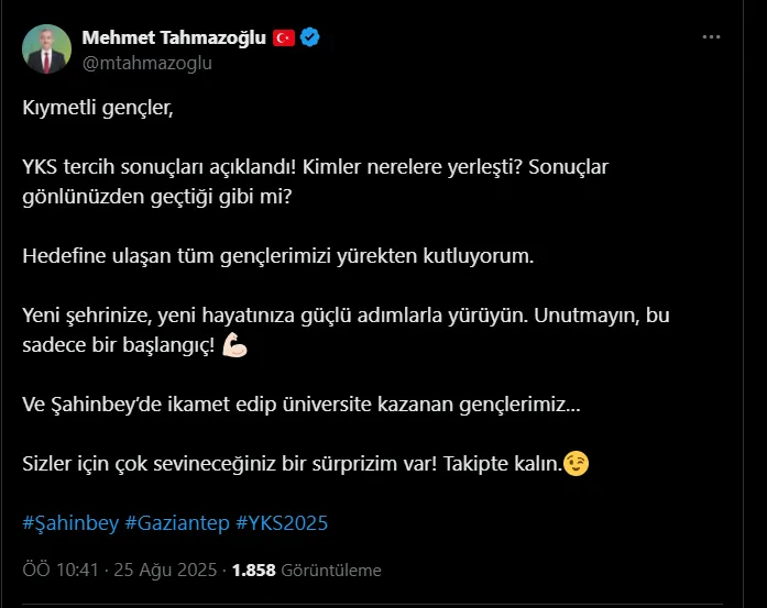 “Sevgili gençler, YKS tercih sonuçları açıklandı. Hedefine ulaşan tüm kardeşlerimi kutluyorum. Yeni şehirlerinizde ve yeni hayatınızda başarılar diliyorum. Unutmayın, bu sadece bir başlangıç. Ve Şahinbey’de ikamet eden, üniversite kazanan gençlerimiz için çok sevineceğiniz bir sürprizim var. Takipte kalın.”