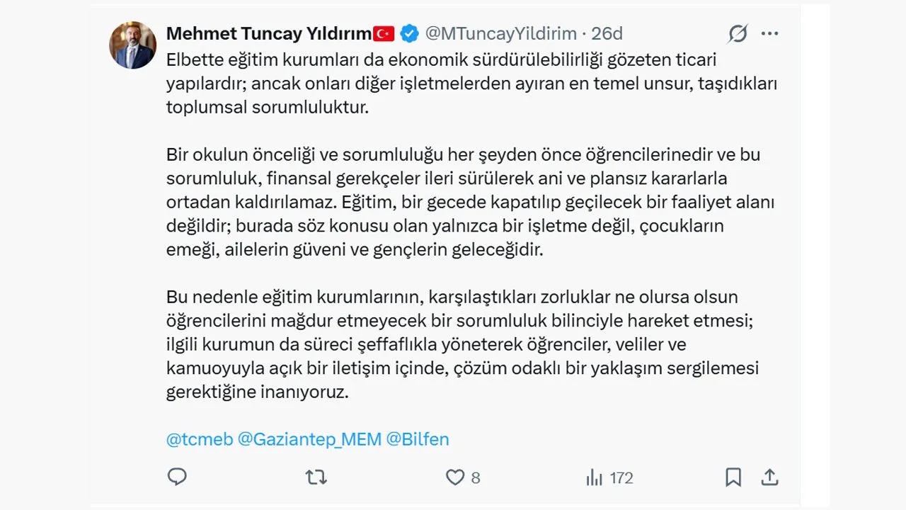 Ve “Eğitim, bir gecede kapatılıp geçilecek bir faaliyet alanı değildir; burada söz konusu olan yalnızca bir işletme değil. Ne zorluklar olursa olsun sorumluluk bilinciyle hareket edilmelidir” dedi.