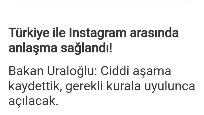 Haberler Gündem Türkiye ile Instagram arasında anlaşma sağlandı! Gündem Türkiye ile Instagram arasında anlaşma sağlandı! 06-08-2024 13:36 285 OKUNMA Bakan Uraloğlu: Ciddi aşama kaydettik, gerekli kurala uyulunca açılacak. Editor : Amatörce Gazetesi Türkiye ile Instagram arasında anlaşma sağlandı!