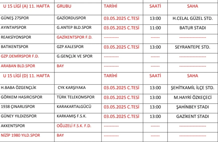 <div>U 15 Ligi A ve D Grubu 11. Hafta </div>