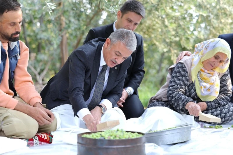 Vali Akkoyun, vatandaşlarla birlikte zeytin hasadına katılarak çiftçi Mucizat Ekinci’ye ait zeytin tarlasında zeytin topladı, ardından vatandaşlarla birlikte yeşil zeytin kırdı.