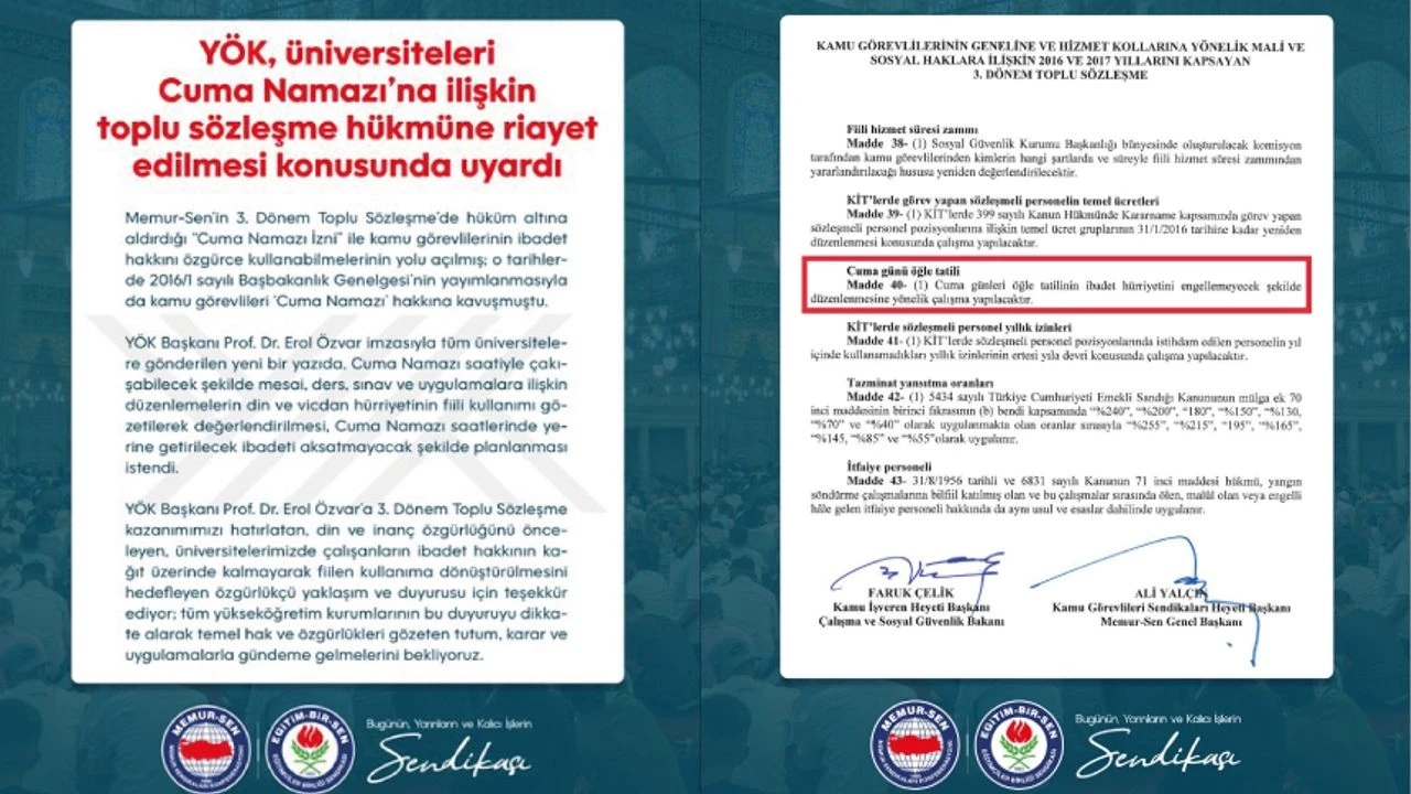 YÖK, üniversiteleri Cuma Namazı’na ilişkin toplu sözleşme hükmüne riayet edilmesi konusunda uyardı Memur-Sen’in 3. Dönem Toplu Sözleşme'de hüküm altına aldırdığı “Cuma Namazı İzni” ile kamu görevlilerinin ibadet hakkını özgürce kullanabilmelerinin yolu açılmış; o tarihlerde 2016/1 sayılı Başbakanlık Genelgesi'nin yayımlanmasıyla da kamu görevlileri 'Cuma Namazı' hakkına kavuşmuştu. YÖK Başkanı Prof. Dr. Erol Özvar imzasıyla tüm üniversitelere gönderilen yeni bir yazıda, Cuma Namazı saatiyle çakışabilecek şekilde mesai, ders, sınav ve uygulamalara ilişkin düzenlemelerin din ve vicdan hürriyetinin fiili kullanımı gözetilerek değerlendirilmesi, Cuma Namazı saatlerinde yerine getirilecek ibadeti aksatmayacak şekilde planlanması istendi. YÖK Başkanı Prof. Dr. Erol Özvar’a 3. Dönem Toplu Sözleşme kazanımımızı hatırlatan, din ve inanç özgürlüğünü önceleyen, üniversitelerimizde çalışanların ibadet hakkının kağıt üzerinde kalmayarak fiilen kullanıma dönüştürülmesini hedefleyen özgürlükçü yaklaşım ve duyurusu için teşekkür ediyor; tüm yükseköğretim kurumlarının bu duyuruyu dikkate alarak temel hak ve özgürlükleri gözeten tutum, karar ve uygulamalarla gündeme gelmelerini bekliyoruz.