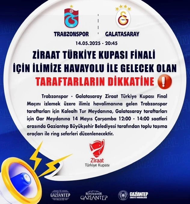 Finalde karşı karşıya gelecek olan Trabzonspor ve Galatasaray taraftarları için Gaziantep Valiliği ve Gaziantep Büyükşehir Belediyesi iş birliğiyle ulaşımda özel düzenlemeler yapıldı.