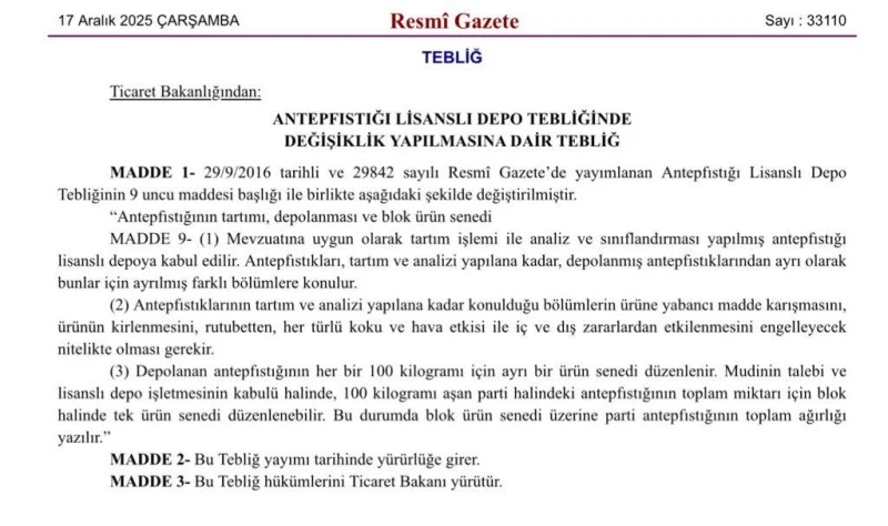 Antepfıstığının Gaziantep ve bölge ekonomisi için stratejik bir ürün olduğuna dikkat çeken Şahin, “Yapılan bu düzenlemeyle antepfıstığının lisanslı depolara kabulünden depolanmasına, tartım ve analiz süreçlerinden ürün senedi uygulamalarına kadar birçok başlıkta daha net ve güvenli bir sistem oluşturulmuştur” dedi.