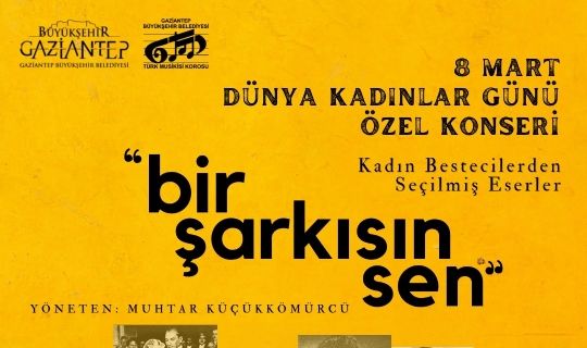 Gaziantep Büyükşehir Belediyesi tarafından 8 Mart Dünya Kadınlar Günü vesilesiyle düzenlenecek, kadın bestecilerden seçilmiş eserlerin seslendirileceği "Bir Şarkısın Sen 8 Mart Dünya Kadınlar Günü Özel Konseri 7 Mart Pazartesi Günü (Bugün) saat 20.00de Onat Kutlar Tiyatro Salonunda düzenlenecek.