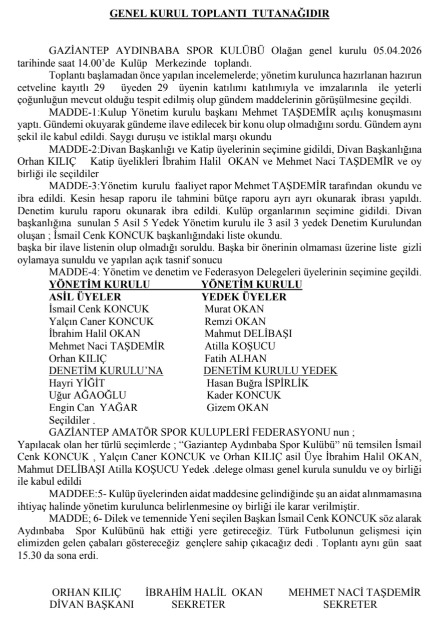 Gündem Gaziantep Aydınbabaspor Kulübü Genel Kurul Toplantı Tutanağı Gaziantep Aydınbabaspor Kulübü Genel Kurul Toplantı Tutanağı 08-04-2026 00:56 GAZİANTEP Gaziantep Aydınbabaspor Kulübü Genel Kurul Toplantı Tutanağı Editor : Amatörce Gazetesi Gaziantep Aydınbabaspor Kulübü Genel Kurul Toplantı Tutanağı 37 OKUNMA