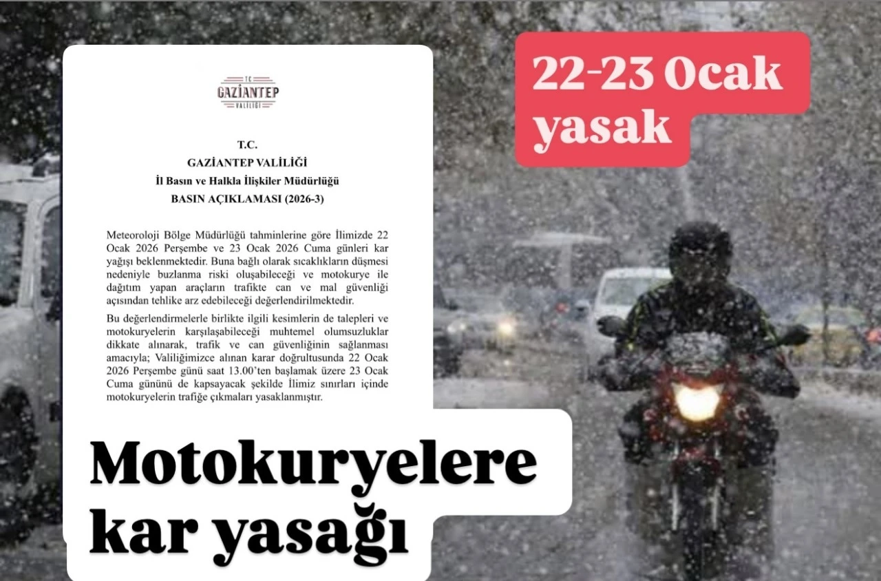 Bu kapsamda alınan kararla, 22 Ocak 2026 Perşembe günü saat 13.00’ten itibaren, 23 Ocak 2026 Cuma gününü de kapsayacak şekilde, Gaziantep il sınırları içerisinde motokuryelerin trafiğe çıkması yasaklandı.