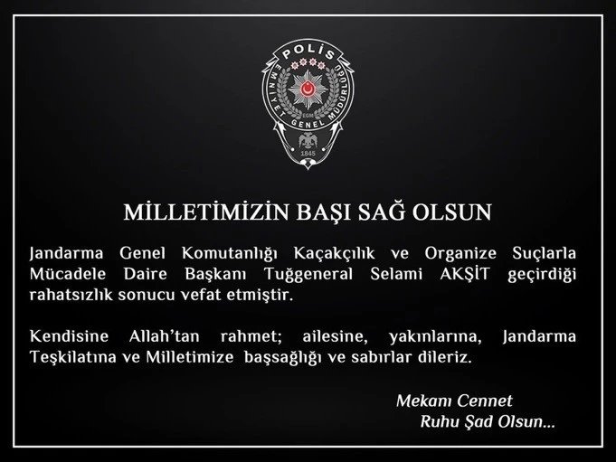 Polis Teşkilatı, yayımladığı taziye mesajında, “Milletimizin başı sağ olsun” ifadelerine yer vererek, “Kendisine Allah’tan rahmet; ailesine, yakınlarına, Jandarma Teşkilatına ve milletimize başsağlığı ve sabırlar diliyoruz. Mekanı cennet, ruhu şad olsun.” açıklamasında bulundu.