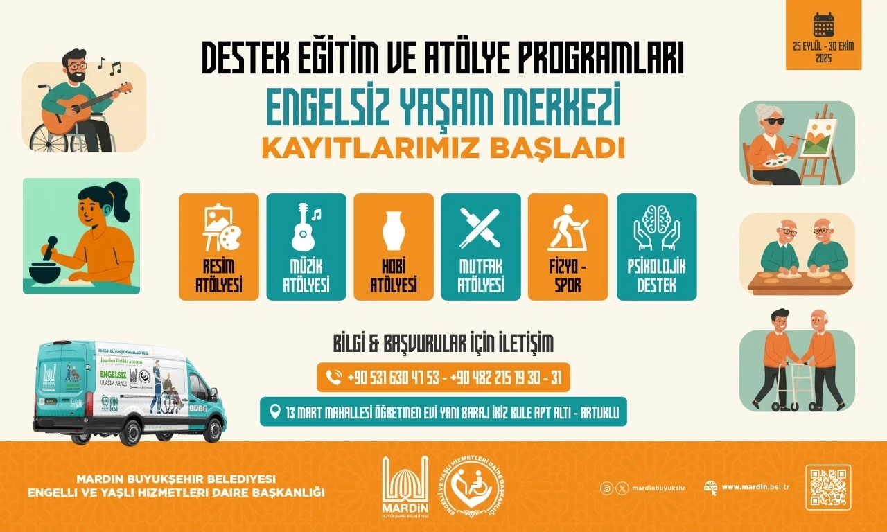 Mardin Büyükşehir Belediyesi Engelli ve Yaşlı Hizmetleri Daire Başkanlığı bünyesinde faaliyetlerini sürdüren Engelsiz Yaşam Merkezi, engelli bireylerin sosyal, kültürel ve kişisel gelişimlerine katkı sağlamak amacıyla yeni dönem Destek Eğitim ve Atölye Programları için kayıtlarını başlattı.