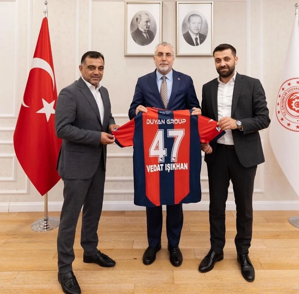 Kulüp Başkanı Rıdvan Aşar ve Asbaşkan Veysi Duyan, Çalışma ve Sosyal Güvenlik Bakanı Prof. Dr. Vedat Işıkhan’ı ziyaret etti. Ziyarette, Bakan Işıkhan’a Mardinspor forması da hediye edildi. Şık ve anlamlı bir jest. Ancak bu ziyaretin perde arkasında neler konuşulduğu ise Mardinli sporseverler tarafından merak ediliyor.